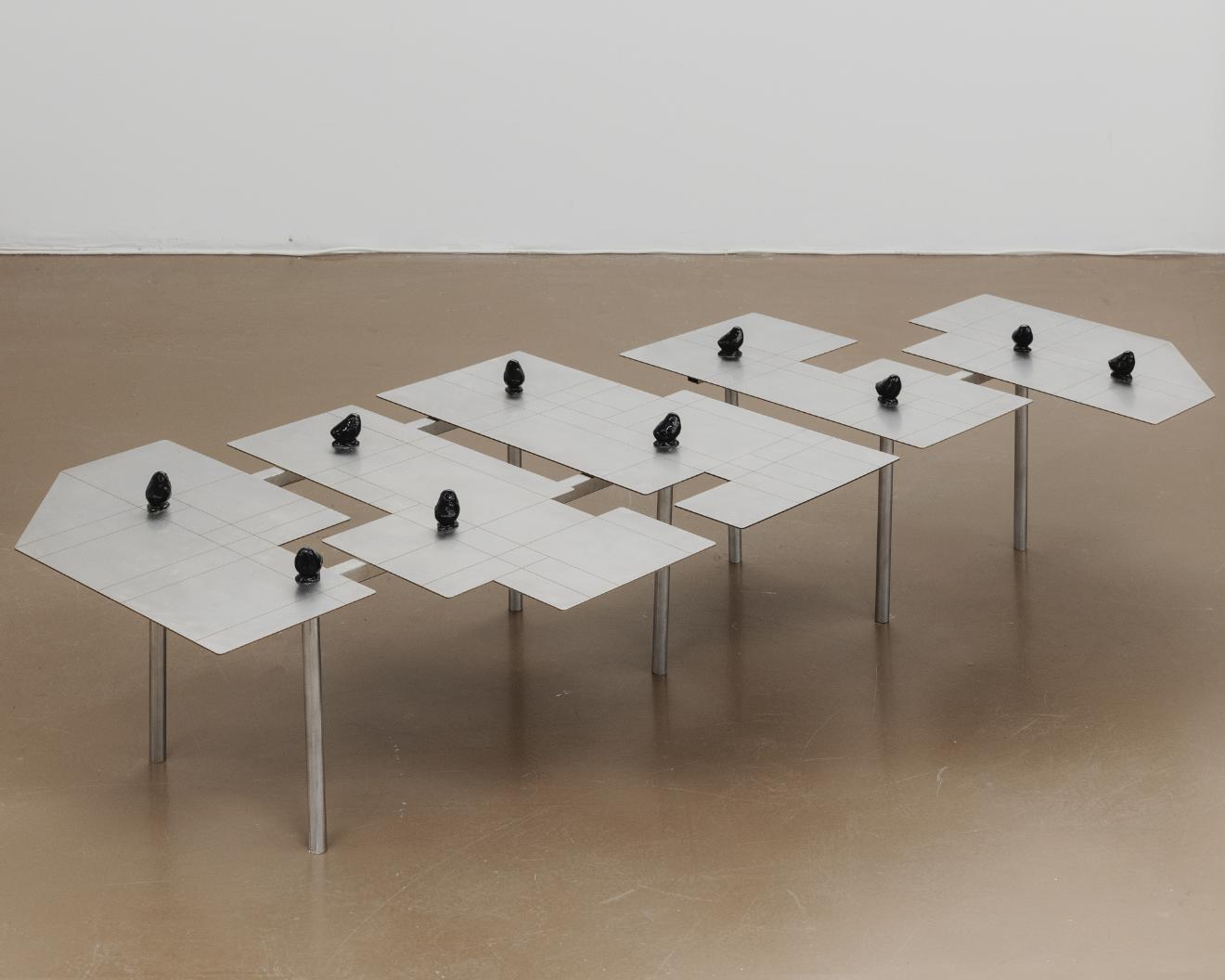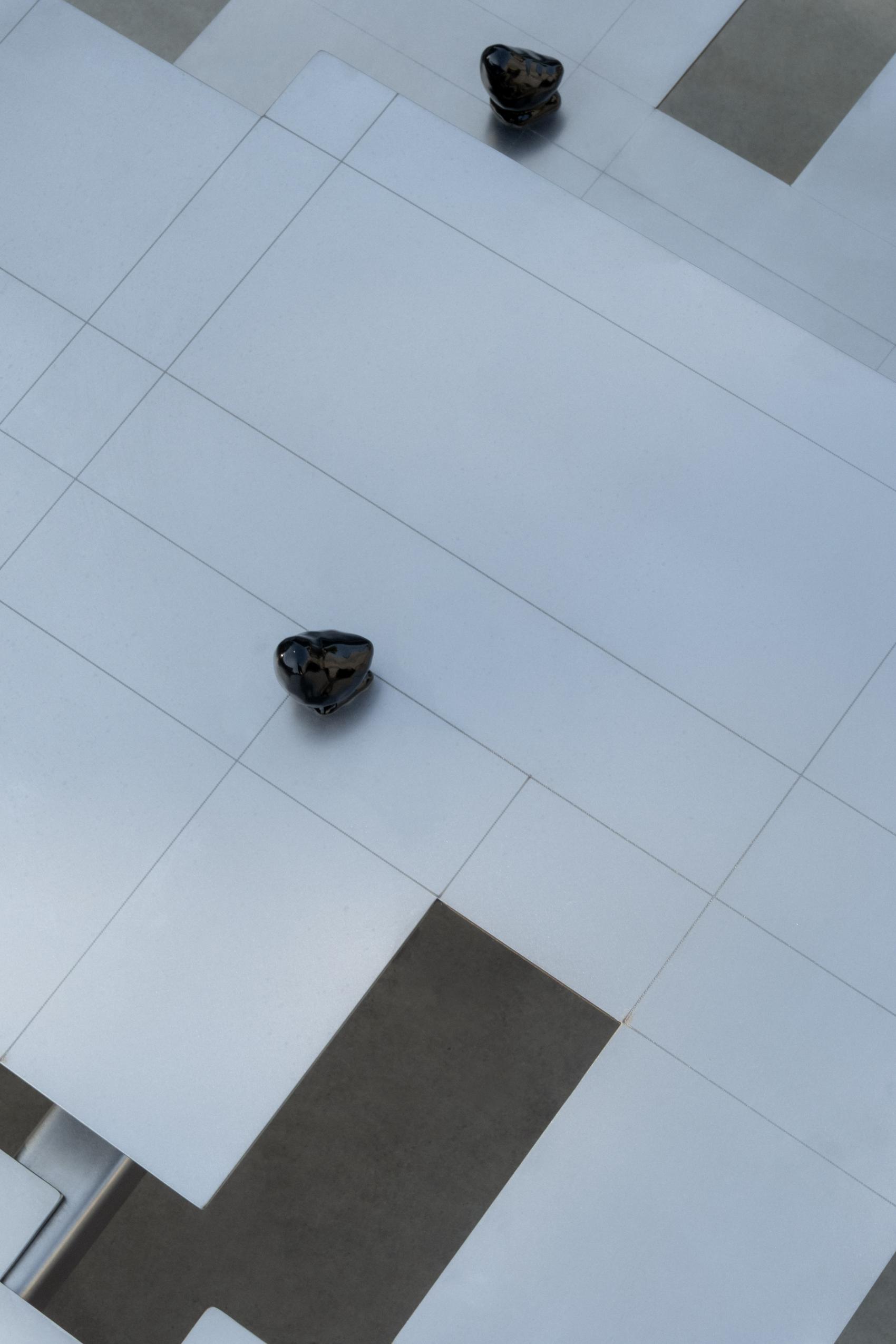 Flying Fragments is a sculptural exhibition table designed as a centerpiece for fashion expos and curated installations. This piece explores the intersection of raw materiality and poetic symbolism, embodying the fragmented yet visionary nature of contemporary fashion design.Structure & Materials:The table is composed of gathered stainless steel plates-each plate shaped uniquely and arranged irregularly to form a broken yet intentional surface. These metal fragments vary in size, orientation, and height, with visible gaps between them. The result is a fragmented landscape that reflects the process of fashion as it evolves through experimentation, failure, and refinement.Floating above and subtly nestled among the metal fragments are elegant black ceramic bird forms. These birds, abstract and stylized, appear to be in mid-flight-either perched on the plates or suspended in motion. Their matte ceramic finish contrasts against the cold, reflective steel, adding warmth, movement, and a sense of narrative.Symbolism:The fragmented steel symbolizes the deconstructed foundation of design-fashion in its raw, unfinished state. The gaps represent opportunity and the creative unknown, while the birds evoke freedom, transformation, and the ever-evolving voice of fashion.